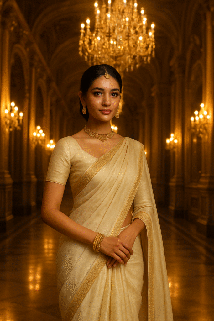 “An Indian girl in a saree posing gracefully in a luxurious palace hallway, surrounded by grand chandeliers and warm golden reflections. Captured in an elegant fashion-photography style with rich textures, premium lighting, and high-detail finishing to create a royal, majestic visual aesthetic.”