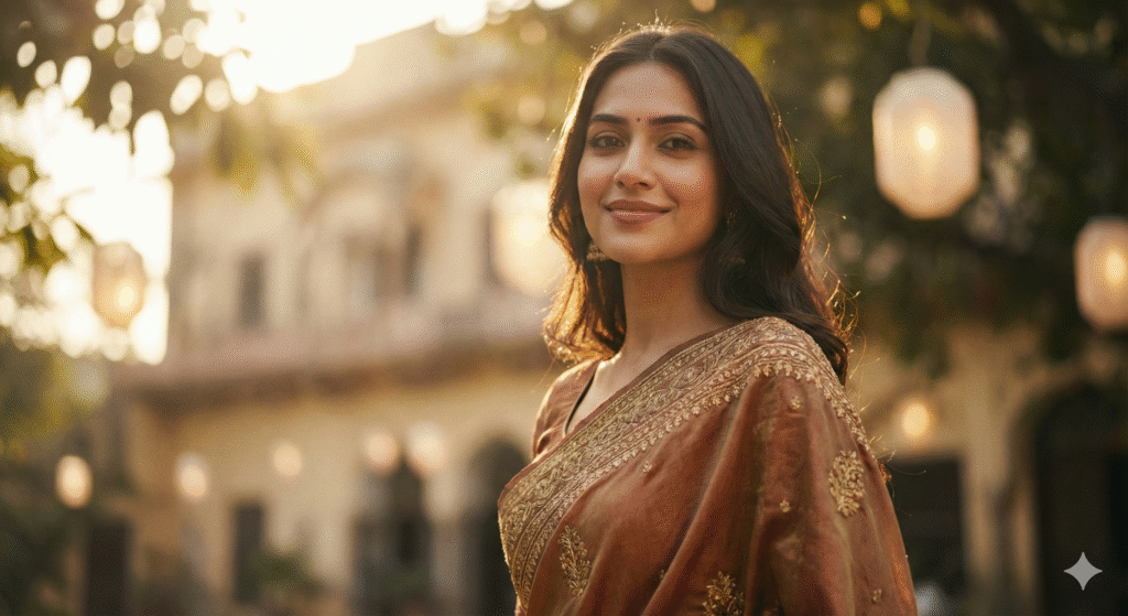 “A soft-glow cinematic portrait of an Indian girl wearing a traditional saree, warm tones, creamy bokeh background, natural sunlight on face, high-resolution fashion photography style.”