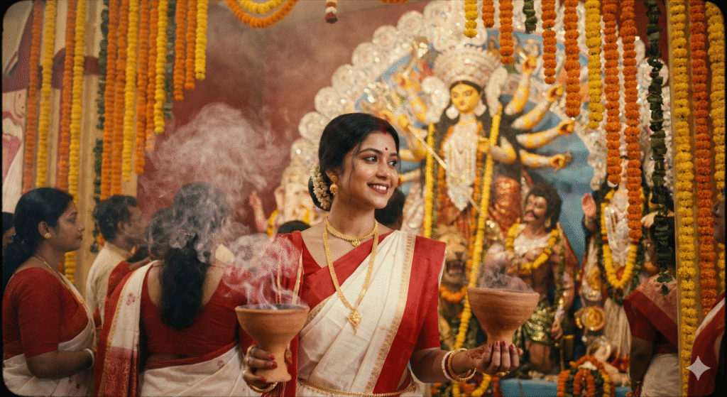 “Girl wearing Bengali red-white saree, festive Durga Puja ambience, soft smoke effect, marigold decorations, cultural mood, cinematic realism.”