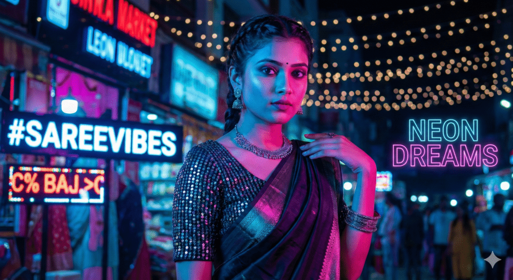 “A vibrant Gen-Z inspired fashion portrait of a girl in a saree enhanced with a trendy neon color-pop effect, glowing background lights, sharp facial detailing, and bold high-contrast editing. The overall look blends modern aesthetics with energetic neon vibes, perfect for eye-catching social media visuals.”