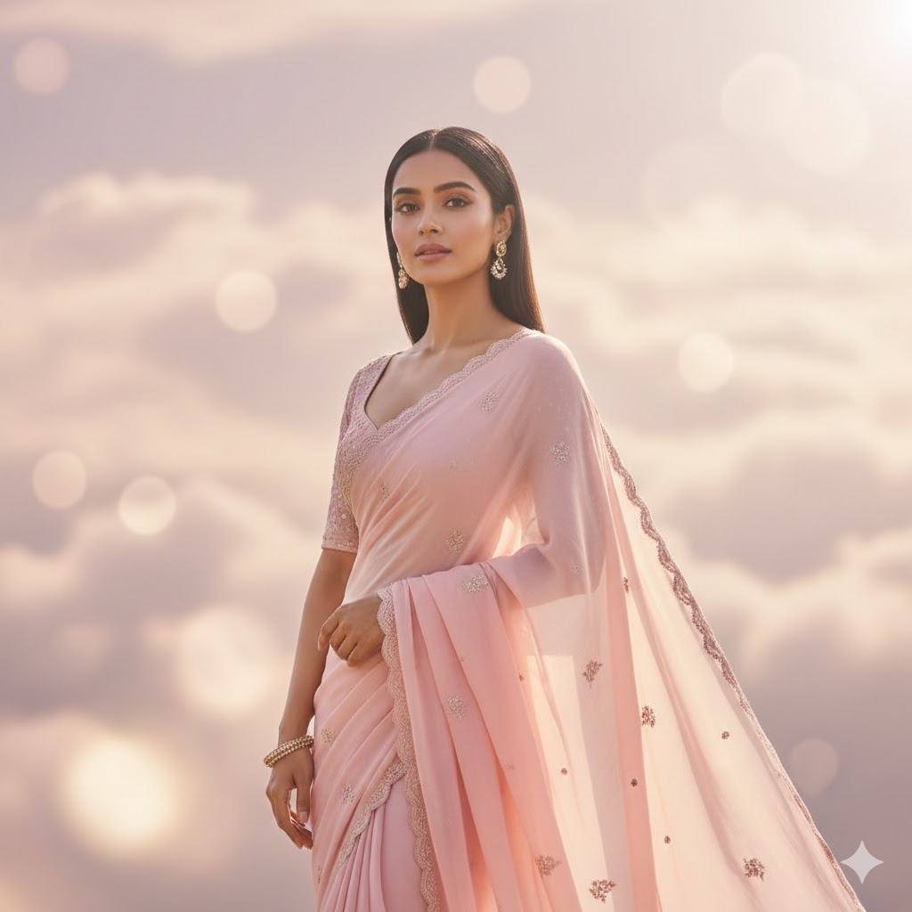 “Ultra-aesthetic pink saree portrait, soft pastel background, dreamy lens flare, glossy skin finish, feminine fashion mood, trending Instagram style.”