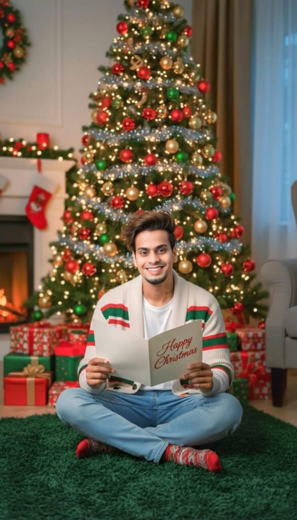 A warm and cozy Christmas scene featuring a young man sitting cross-legged on a green rug in a living room. He is wearing a cream-colored knitted cardigan with red and green stripes and light blue pants. He is smiling while reading a Christmas card that says ‘Happy Christmas.’ Behind him stands a beautifully decorated Christmas tree with red, green, and gold ornaments, sparkling tinsel garlands, and warm fairy lights. Wrapped gifts sit under the 🌲