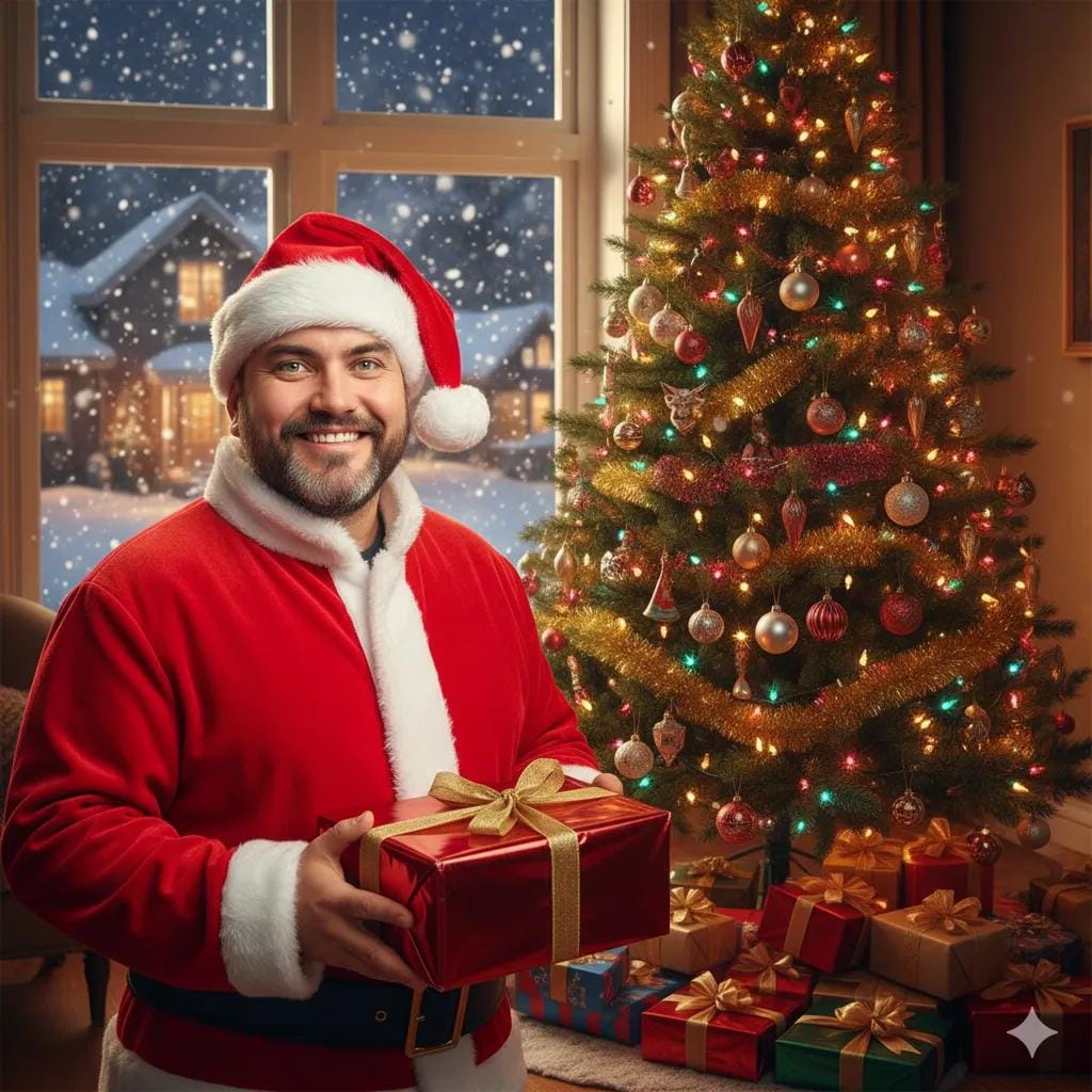 “A hyper-realistic HD photo showing me celebrating Happy Christmas Day 🎄🎁. I am standing beside a beautifully decorated Christmas tree glowing with colorful lights and ornaments. There are wrapped gifts all around, snow gently falling in the background, and warm golden lights creating a cozy festive atmosphere. I’m wearing a stylish red winter outfit with a Santa hat, smiling happily, and holding a Christmas gift in my hand.”