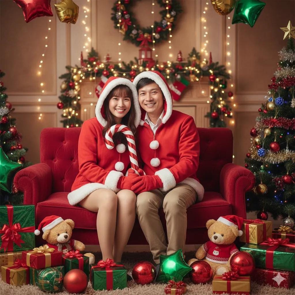 “Romantic Christmas couple portraitA young couple dressed ( use the uploaded image)in a festive red outfit with a hood and gloves,they holding both hands a large candy cane. They sitting amidst with long dark brown hair various Christmas decorations, including gift boxes, teddy bears, balloons, and a small Christmas tree. The background features more holiday decor, creating a vibrant and playful atmosphere.”dont change the face and hairstyle., snow background, warm lights bokeh, matching red outfits, DSLR portrait style, skin-smooth, 8K clarity.”