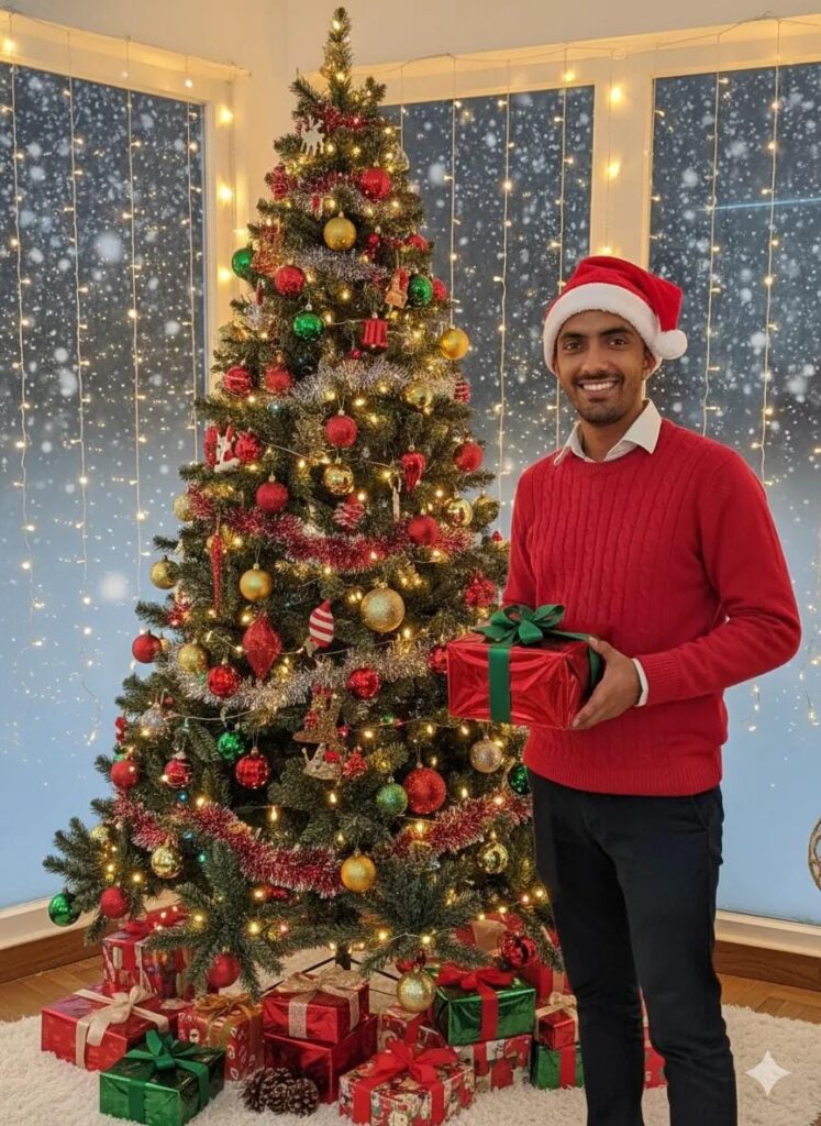 “A hyper-realistic HD photo showing me celebrating Happy Christmas Day 🎄🎁. I am standing beside a beautifully decorated Christmas tree glowing with colorful lights and ornaments. There are wrapped gifts all around, snow gently falling in the background, and warm golden lights creating a cozy festive atmosphere. I’m wearing a stylish red winter outfit with a Santa hat, smiling happily, and holding a Christmas gift in my hand.” 🎅🎁❄️