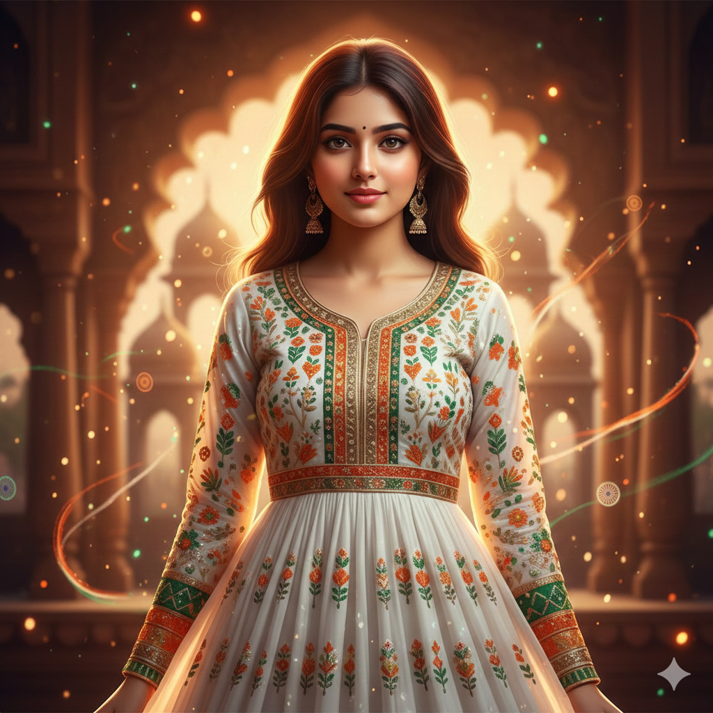 Transform the uploaded girl’s image into a Republic Day-themed AI portrait. Maintain original face details. She is wearing a traditional white outfit with tricolor embroidery. Add a warm festive glow around her face with soft shadows and light particles in the background. The mood should feel peaceful, proud, and culturally rich.