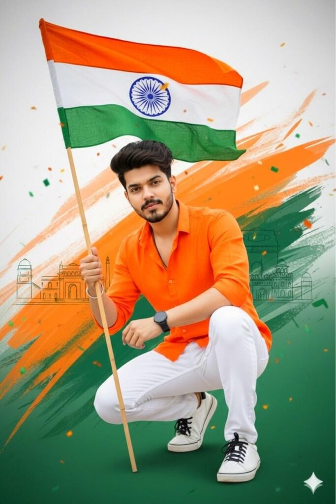 “A high-quality same as uploaded face and features uploaded image, vibrant Indian Republic Day portrait. A young man with light, He is wearing a crisp orange long-sleeved shirt, white pants, and whiye sneakers with black sole and laces. Black Wrist watch on hand, He is in a confident crouching pose, holding a pole with the Indian national flag.. The background is a creative fusion of saffron,