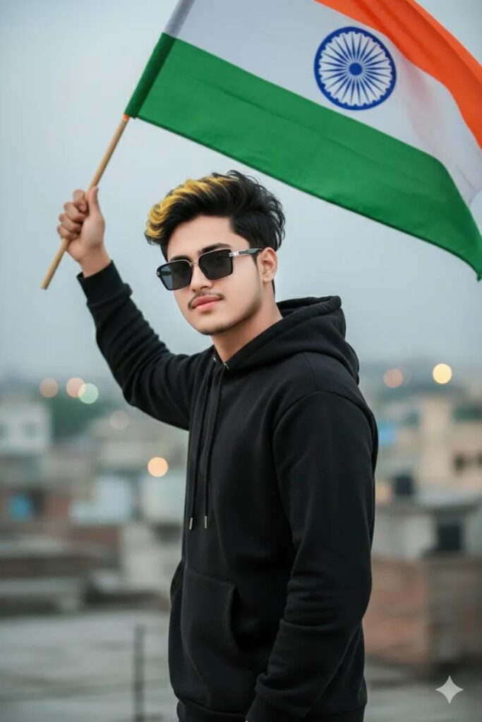 Pose: standing in a stylish hero pose, Indian flag flying high in hand, confident soft smile look, eyes looking forward Outfit: stylish black hoodie, modern street-hero vibe Accessories: box-style stylish sunglasses