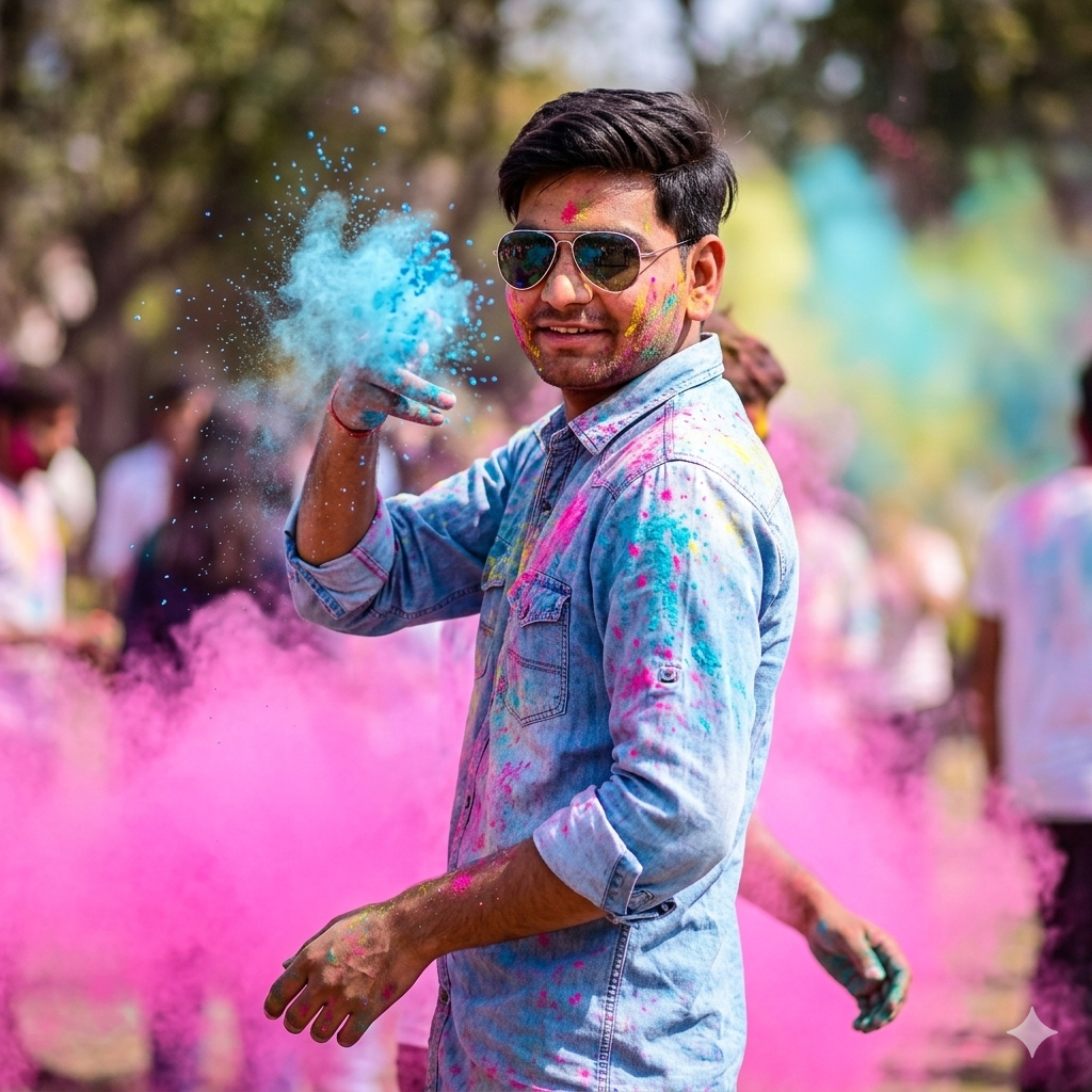 Dynamic Holi shot of a young man in a light blue denim shirt with sleeves rolled up, splattered with bright pink and cyan powder. Reflective sunglasses, same as uploaded photo hair. He’s turning slightly to the side while tossing blue gulal forward. Thick pink smoke cloud around waist level. Bright daylight, soft blurred background, high-speed capture of flying particles shallow depth of field, 50mm lens, crisp detail, vibrant color grading And don’t change face