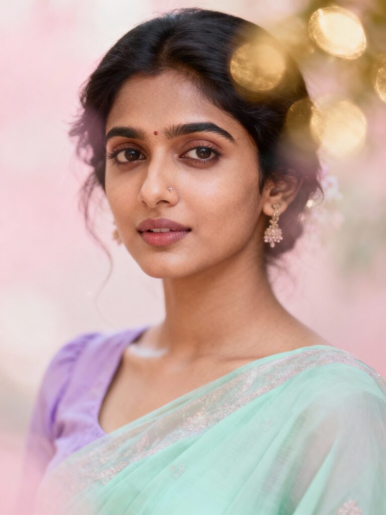 soft pastel Indian Instagram portrait, creamy tones, smooth lighting, dreamy haze, depth-of-field background blur, gentle highlights, warm romantic mood, subtle grain, clean color grading, calming viral-ready aesthetic, 2026 pastel trend