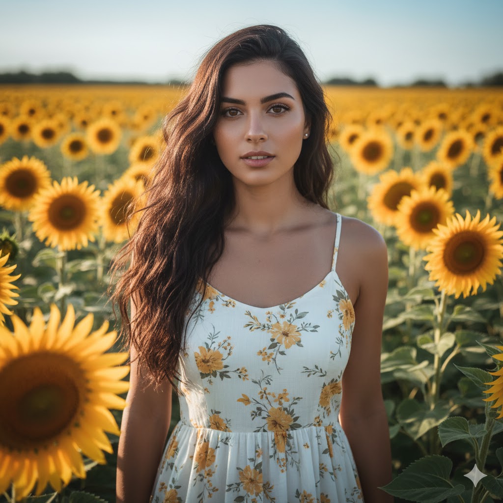 Girl wearing white floral dress standing in sunflower field, natural sunlight, dreamy wide-angle shot, warm glow, long hair moving in wind, cinematic color grading, highly detailed eyes, DSLR-style focus, Gemini AI portrait realism, pure vibe aesthetic, peaceful and inspiring atmosphere.