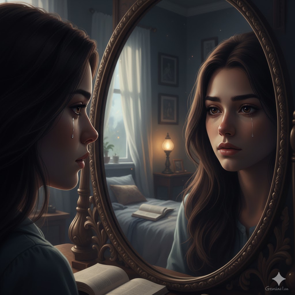 Girl looking into mirror with deep expression, moody lighting, realistic reflection, slight tear in eyes, emotional storytelling portrait, aesthetic bedroom setup, soft focus depth, Gemini AI fine-art realism, dramatic cinematic tone, perfect Instagram aesthetic for emotional edits.