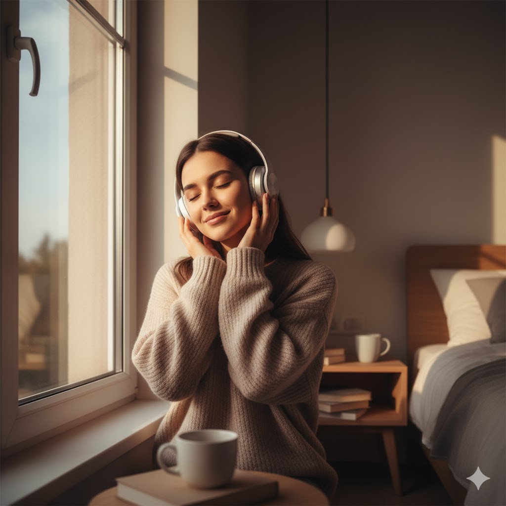 Girl sitting near window with headphones, listening to music, peaceful expression, warm ambient lighting, cozy bedroom setup, Gemini AI cinematic portrait, realistic shadows, calm vibe, aesthetic photo tone, modern minimalistic composition, emotional storytelling through light and expression.