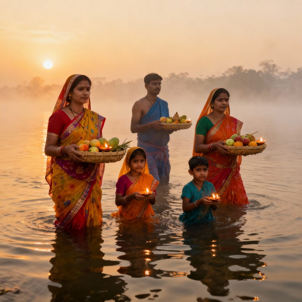 “Indian family standing waist-deep in river during sunrise, holding bamboo baskets with fruits and diyas, colorful sarees, traditional puja vibe, foggy morning atmosphere, Chhath Puja AI photo.”