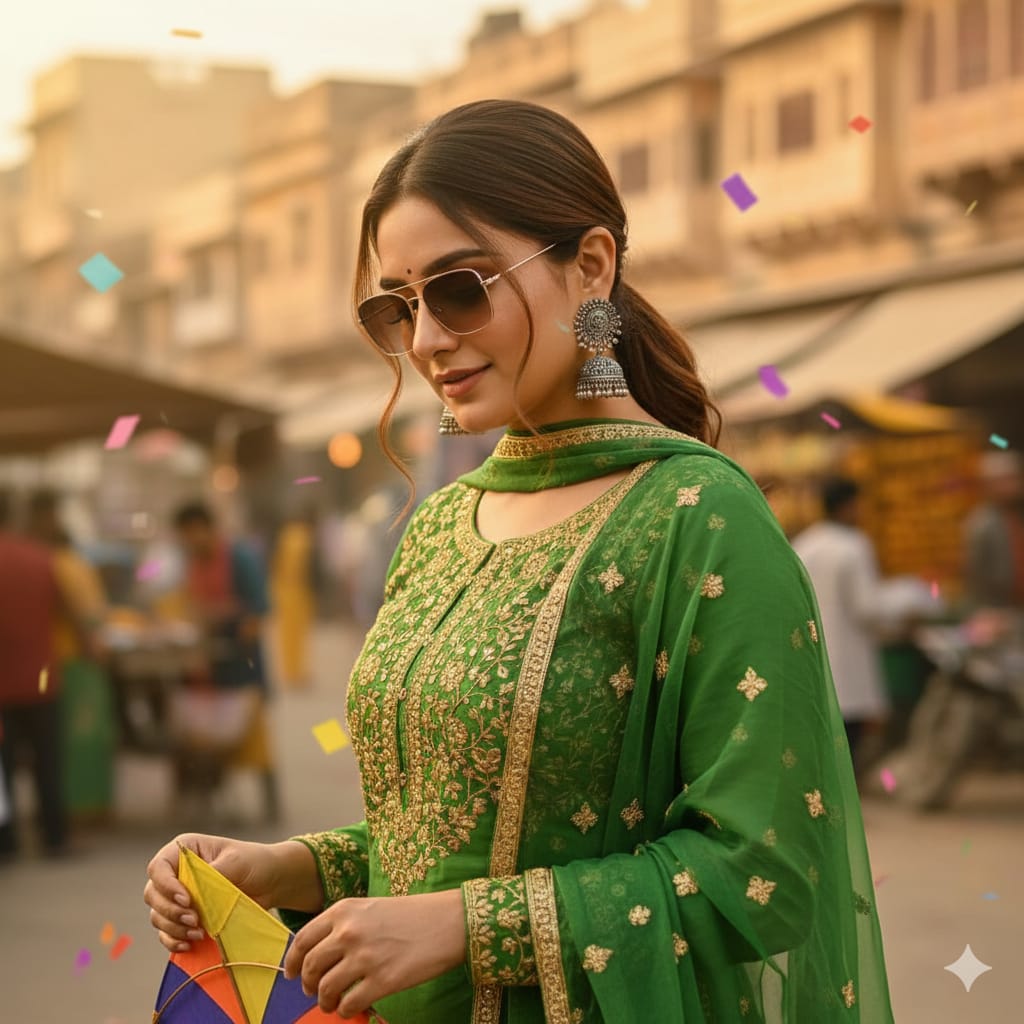 “Create ultra photorealistic hyperdetailed close-up shot of a woman (the reference image given) wearing green golden embroidery kurti and matching sheer dupata. Wearing a silver oxidised jhumka, stylish sunglass. She is standing in slightly side pose holding a kite, eyes looking down in a softly blurred urban street.100% unchanged face no alteration