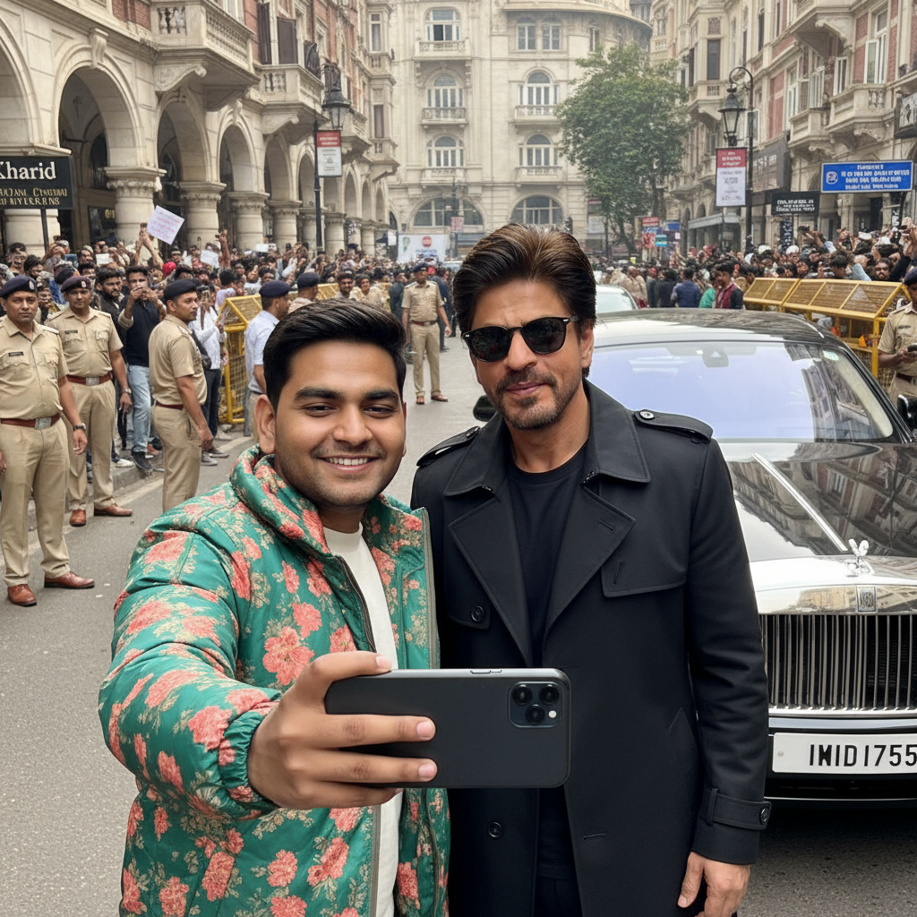 A REALISTIC SELFIE OF A YOUNG INDIAN MAN (BASED ON THE REFERENCE IMAGE) TAKING A SELFIE ON A LUXURIOUS STREET IN MUMBAI STANDING BESIDE HIM IS BOLLYWOOD SUPERSTAR SHAH RUKH KHAN, WEARING A STYLISH BLACK COAT, BLACK SUNGLASSES, AND SPORTING A LIGHT BEARD. BOTH ARE SMILING AND LOOKING AT THE CAMERA. BEHIND SHAH RUKH KHAN. A LUXURY ROLLS-ROYCE CAR IS PARKED. A LARGE CROWD OF FANS IS GATHERED BEHIND THEM. TRYING TO CATCH A GLIMPSE OF THE SUPERSTAR. WHILE POLICE ARE PRESENT, CONTROLLING THE CROWD. THE BACKGROUND FEATURES UPSCALE MODERN MUMBAI ARCHITECTURE, STREET SIGNS, A TOUCH OF TRAFFIC, AND A CLEAR DAYLIGHT ATMOSPHERE. THE SELFIE SHOULD LOOK NATURAL, AS IF TAKEN WITH A SMARTPHONE, WITH REALISTIC LIGHTING, EXPRESSIONS, AND URBAN DETAILS.