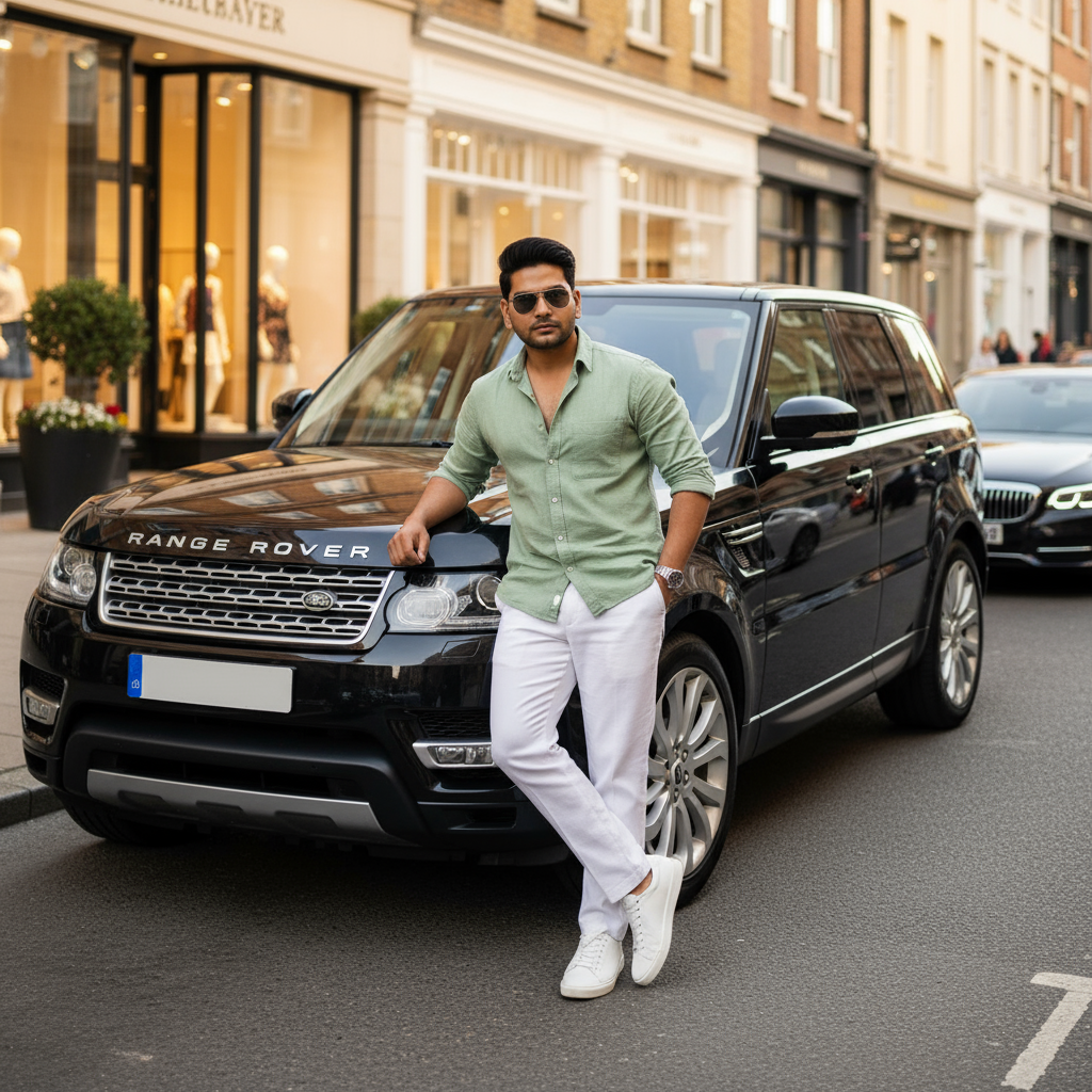 A confident man leaning casually against a sleek black Range Rover in an urban street setting. He is wearing a light green open collar shirt with rolled up sleeves, white linen pants, and stylish sneakers. His look is completed with dark sunglasses, a wristwatch, and a well-groomed beard exuding a modern and luxurious street style vibe. The background includes boutique storefronts, parked cars, and warm urban architecture, enhancing the sophisticated lifestyle atmosphere signature onlinesapne right down