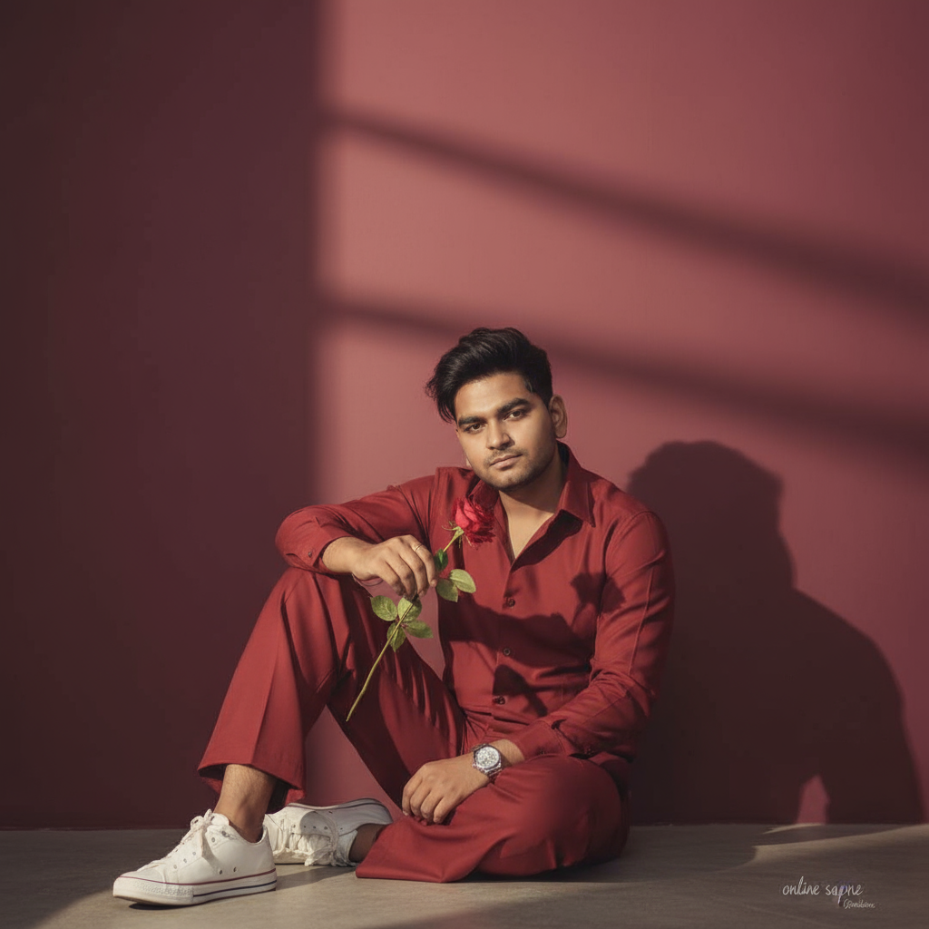 A full-body, camera look-angle portrait of me, approximately 5'9" tall. He is sitting on the ground in a stylish pose against a solid deep wine-colored wall, with deep shadows creating a 90s movie and romantic, windy environment. He is wearing a perfect red wine-colored, retro aesthetic shirt with matching pants