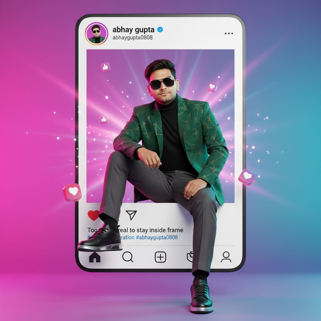 A hyper-realistic, striking portrait of the uploaded stylish young man as the absolute star, posed inside an oversized instagram post frame that fills most of the composition, designed to look like a real social media feed. Her face romains untouched, flawless, and magnotic instantly drawing attention. She wears trendy fashion, chic dark sunglasses, and sleek footwear, giving her a confident, modern aura. She sits effortlessly inside the Instagram frame: night elbow resting lightly on her knee, left arm relaxed. One leg breaks forward through the Instagram frame in a bold 3D Illusion as if she's stepping out of the digital world into reality. The Instagram frame dominates the image, highly realistic with username abhay gupta, verified checkmark, display name "abhaygupta0808", caption "Too real to stay inside frame #AlCreation #abhaygupta0808", plus authentic icons heart, comment, share, save protile) Amplifying depth and cerspective. The background is designed for instant virality: a radiant neon gradient of hot pink, electric purple, and glowing turquoise, creating a dreamy, futunstic glow. Soft light rays and subtle sparkles highlight the instagram frame, making it pop as if it's lit by stage lights Floating 3D social media icons thearts, likes, spark emojis) hover subtly around the frame, adding a dynamic, viral aesthetic. Balanced cinematic lighting ensures her face and fashion textures stand out, while the Instagram frame and 3D leg illusion dominate with a surreal, iconic vice