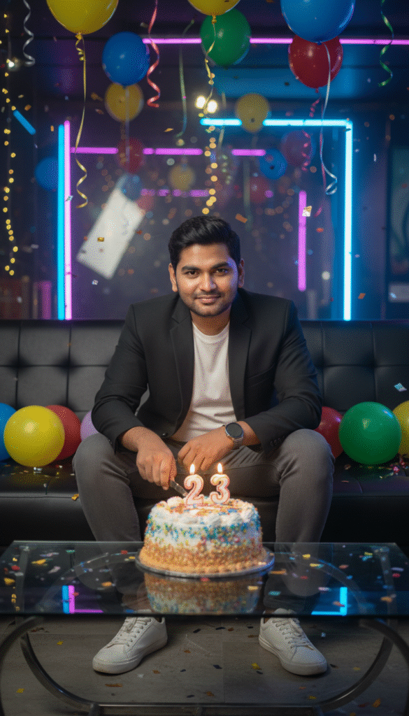 Ultra-realistic 8K cinematic full-body portrait of a 23-year-old Bangladeshi man sitting on a sleek black leather sofa in a modern, stylish lounge, leaning slightly forward with elbows resting on his knees, in an engaged and approachable pose. His face and hairstyle exactly match the uploaded reference image, with perfectly styled hair, and his face looking directly at the camera with a subtle confident smile. He wears a perfectly tailored monochrome blazer over a casual shirt, slim-fit pants, crisp white sneakers, and a smartwatch. In front of him is a large, elegantly decorated birthday cake with "23" candles lit, which emits a soft warm glow illuminating his face. He holds a cake-cutting knife in his hand, ready to slice the cake. Colorful balloons, shimmering confetti, and vibrant festive decorations float around subtly. Neon lights, fairy lights, and reflective surfaces create dynamic colorful reflections on glass, metal, and plush textures, enhancing the celebratory, party atmosphere.