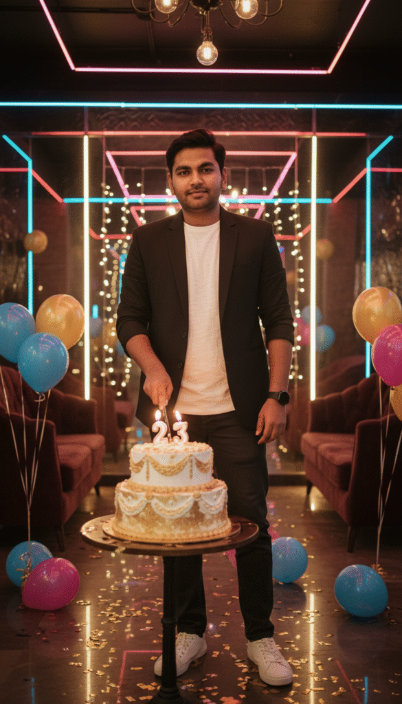 Ultra-realistic 8K cinematic full-body portrait of a 23-year-old Bangladeshi man standing confidently in a modern, stylish lounge, leaning slightly forward in an approachable pose. His face and hairstyle exactly match the uploaded reference image, perfectly styled, looking directly at the camera with a subtle confident smile. He wears a perfectly tailored monochrome blazer over a casual shirt, slim-fit pants, crisp white sneakers, and a smartwatch. Directly in front of him is a large, elaborately decorated birthday cake, prominently placed, glowing warmly with "23" candles lit. He holds a cake-cutting knife in his hand, ready to slice the cake. Colorful balloons, shimmering confetti, and vibrant festive decorations surround the scene. Neon lights, fairy lights, and reflective surfaces create dynamic colorful reflections on glass, metal, and plush textures, enhancing the celebratory, party atmosphere.
