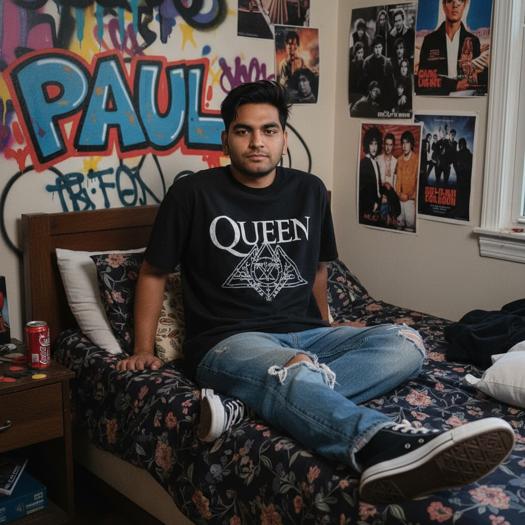 Seorang pemuda asia berambut sedikit berantakan sedang berbaring santai dia atas ranjang sambil melihat ke kamera dengan Espresi tenang, ia memakai Kaos hitam oversize dengan ilustrasi Rock dengan text "QUEEN" dan Celana rip baggy jeans biru pudar dan Sepatu sneakers converse. la berada Kamar Remaja Era