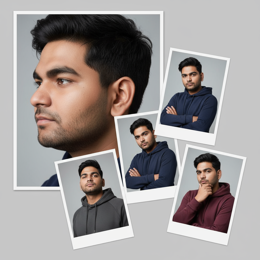 A large, crisp close-up profile shot dominates the upper left. Other smaller "prints" show him in various hoodies (charcoal grey, navy blue, maroon) and poses, including a low-angle shot looking up, a medium shot with arms crossed looking seriously, and a thoughtful pose with his hand on his chin. The lighting is bright and professional, creating sharp details and a high-fashion look. Hyper-realistic, professional photography, sharp focus, 8K.