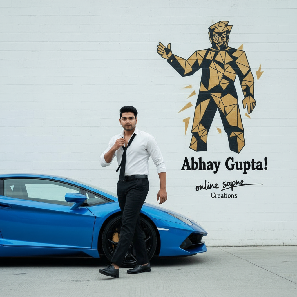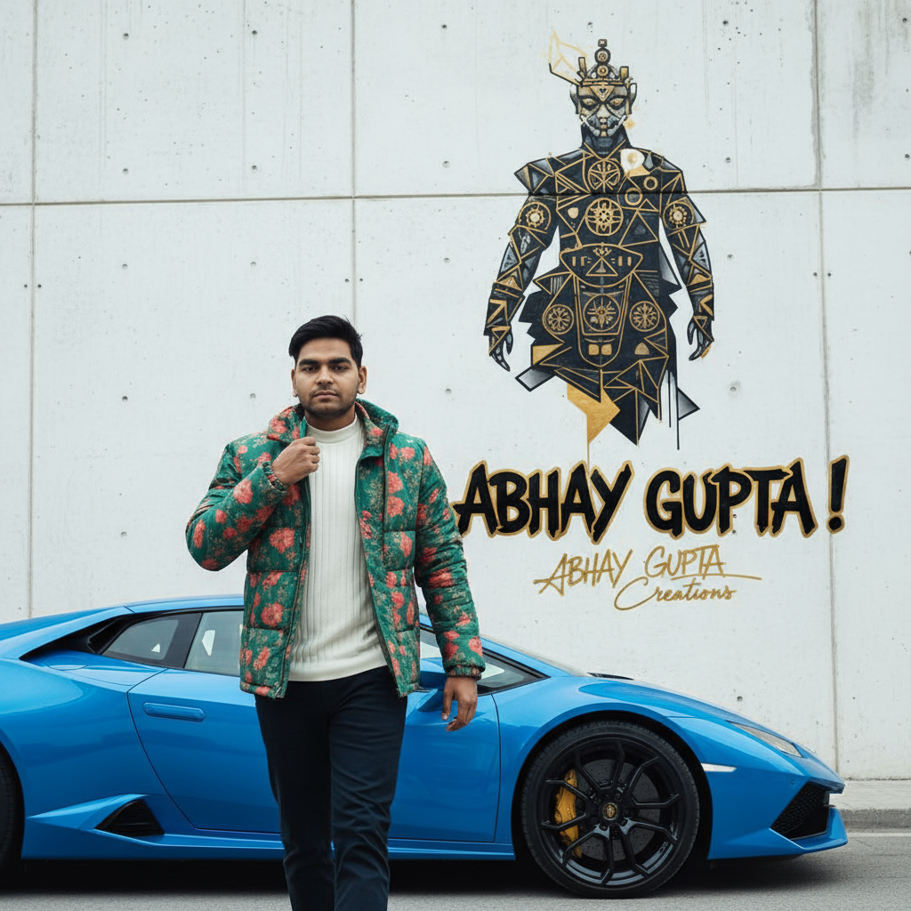 Photo-realistic 8K full-body shot of a 20-year-old handsome Asian young man walking confidently beside a full-view blue Lamborghini luxury sports car parked by a white concrete wall. Outfit stays exactly the same. Pose: mid-step, one hand adjusting collar or jacket, the other swinging naturally, head slightly turned with a confident gaze, exuding runway-style fashion motion. Camera angle: low and dynamic, capturing full car and full body in cinematic perspective with motion energy. Full body visible, natural height. On the wall behind, a large stylish vector mural of the character in black-and-gold geometric style. Write the character's name under it in bold graffiti-inspired lettering: 'Abhay Gupta!' Signature: online sapne Creations.. Keep my face exactly the same as the uploaded photo. Do not change or edit my face.