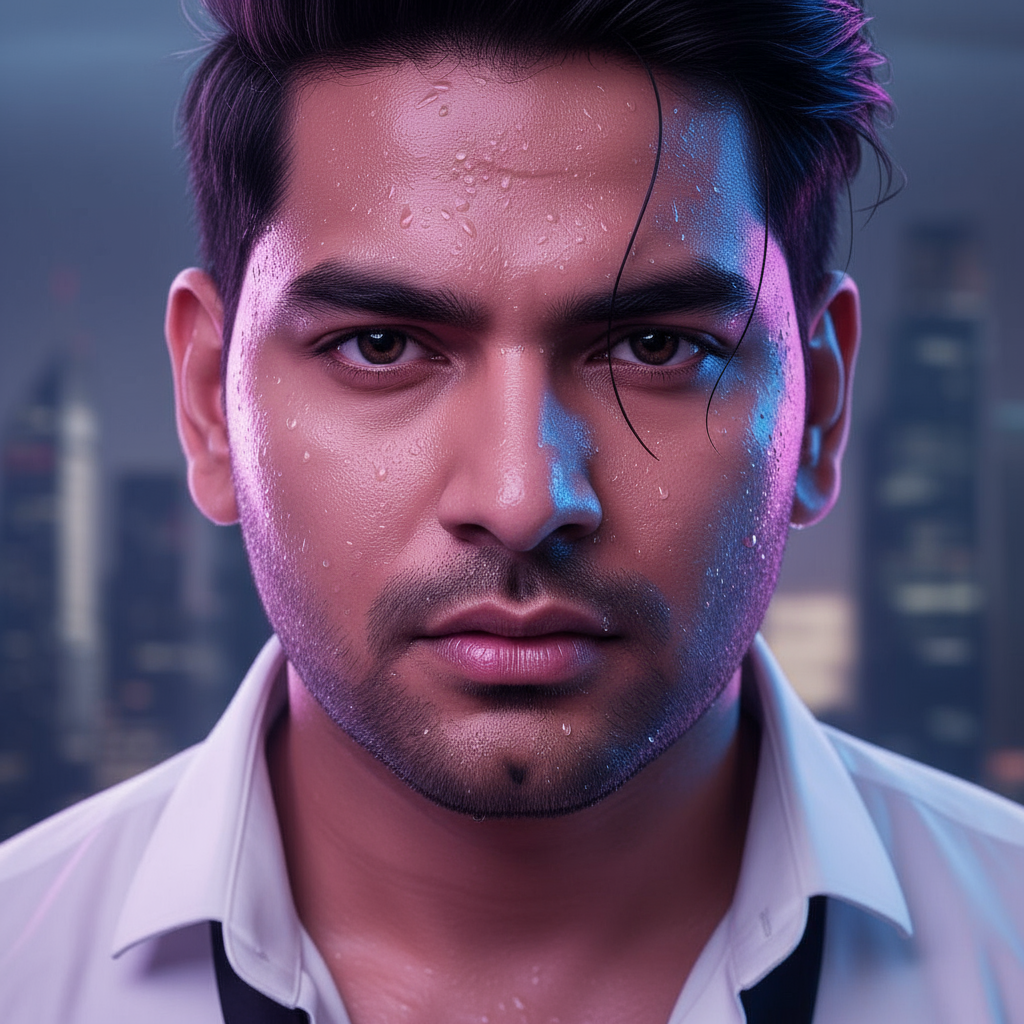 Create a hyper realistic, cinematic close-up portrait of the same person, preserving their exact facial structure and features. Style it as futuristic digital art with ultra-detailed SK* resolution. The skin should have a high-gloss almost glassy finish-enhanced with fine water droplets that catch and reflect light, giving a luminous, dewy effect. Introduce a dramatic blend of neon lighting: soft magenta on one side, electric blue on the other, and subtle violet undertones, creating rich gradients and sharp highlights across the contours of the face.