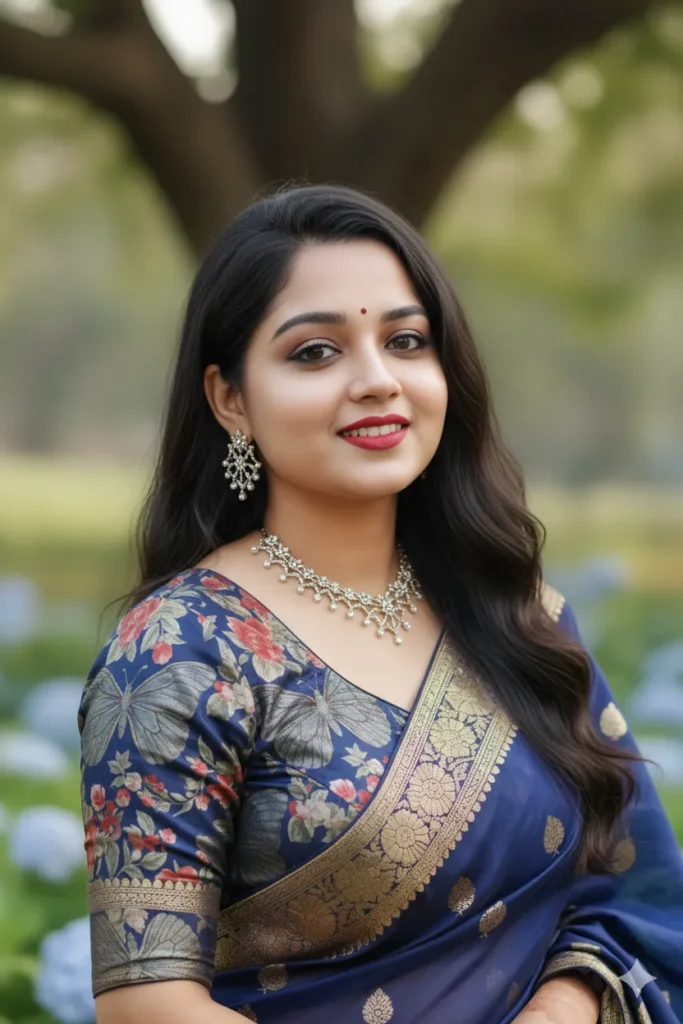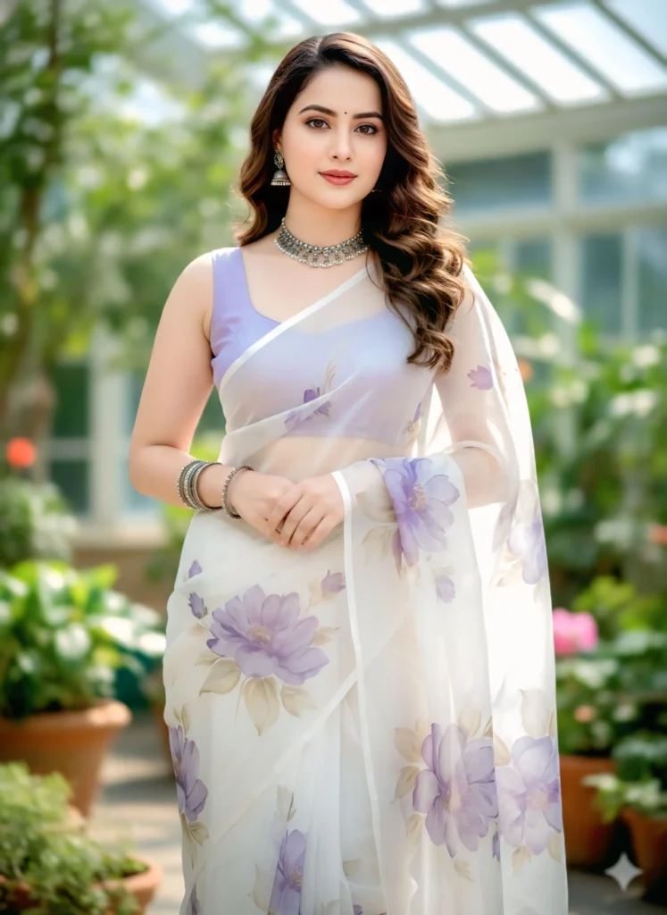 ”A beautiful woman draped in a sheer white organza saree featuring large, soft hand-painted lavender floral motifs. The saree is lightweight and crisp. She is paired with a matching lavender silk blouse and small pearl earrings. The lighting is bright and airy, making the saree look delicate and sophisticated. High-detail fabric texture, 8k resolution. Oxidized silver jwelary.