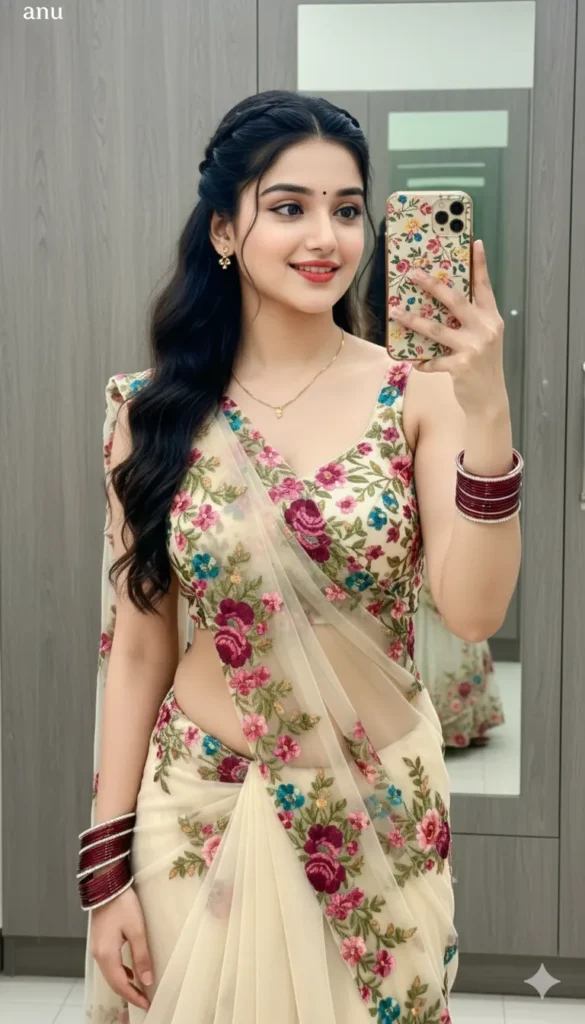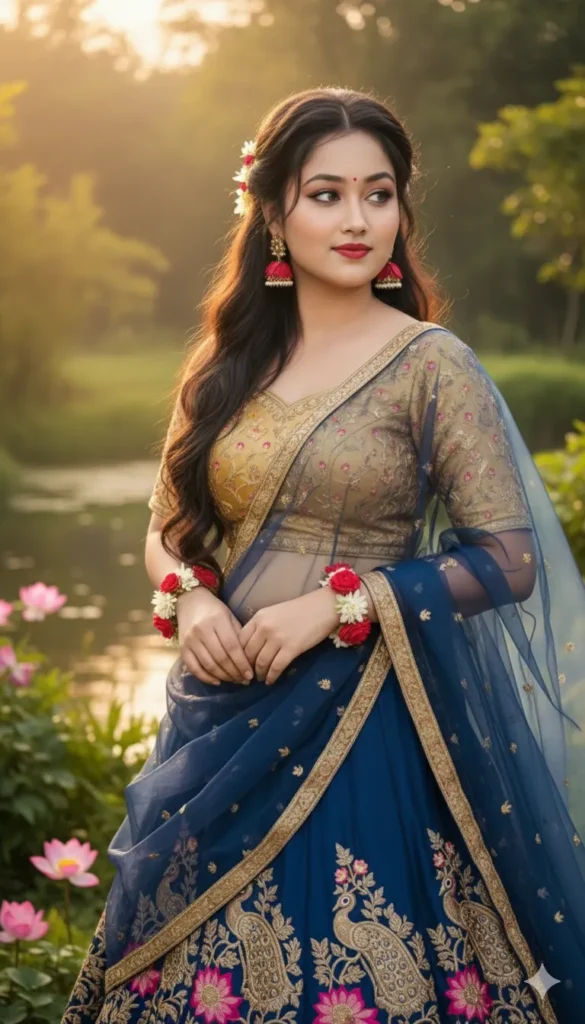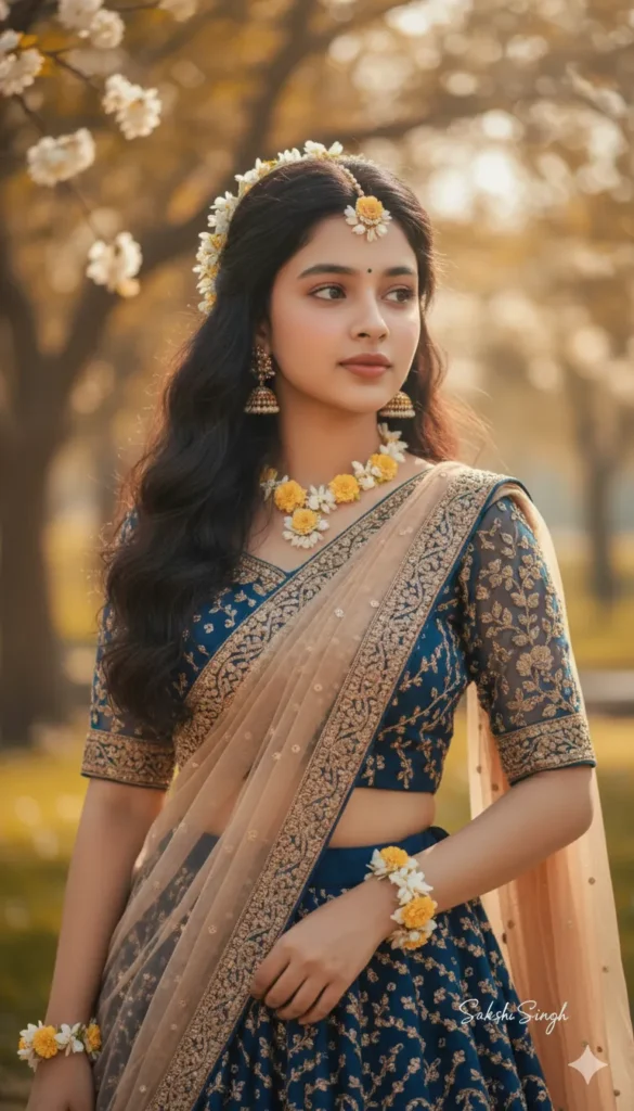 A young Indian woman converting her into radha with long, dark, wavy hair cascading over her shoulders She is wearing a translucent, elegant radha j dress draped over one shoulder, revealing a fitted blouse with simple elegant heavy lehenga. flowers are tucked as a jwellery. she is looking slightly to her right, with a soft, serene expression. Don’t change the fece. Sakshi Singh sign.