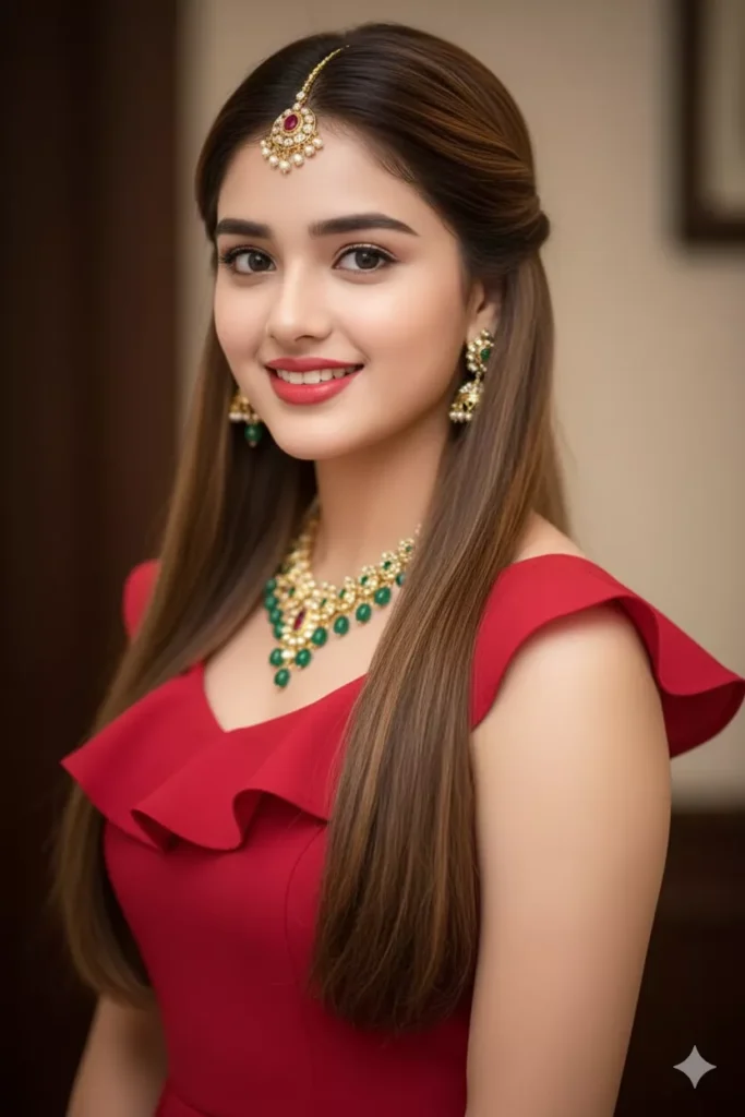Prompt A hyper-realistic portrait of the young woman, elegant woman in a red sleeveless dress with ruffled neckline, front capture soft side-profile look facing the camera with peaceful expression, gold green necklace with matching jewelry, a gold red stone Tikka jhumka center of her head ,rosy pink-red lips, a gentle smile, long sliding layered straight waist-length hair with soft brown-gold highlights extremely thick, background indoor with DSLR effect, don’t change the original face.