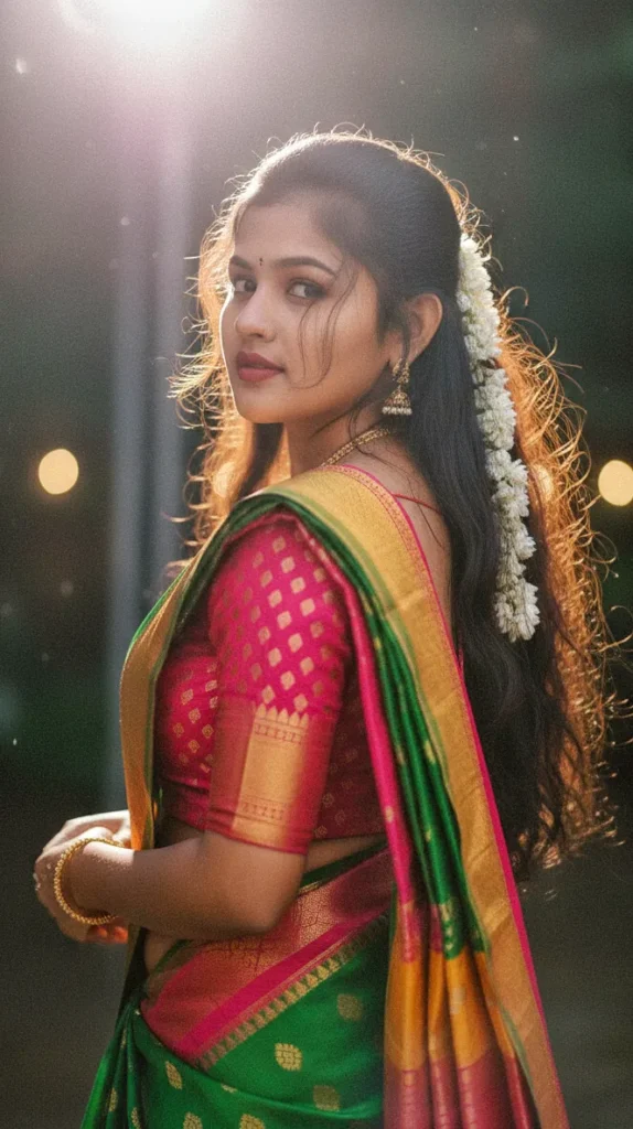 Prompt by: Create a dreamy portrait of me with long espresso brown hair falling freely down my back in loose waves On my hairs there’s white gajra over my straight hairs and my hairs are tied with that gajra, not properly and flicks over my face., I’m posing with my back slightly turned to the camera looking over my shoulder with a confident sultry expression I’m wearing green and pink yellow south indian saree with a matching,