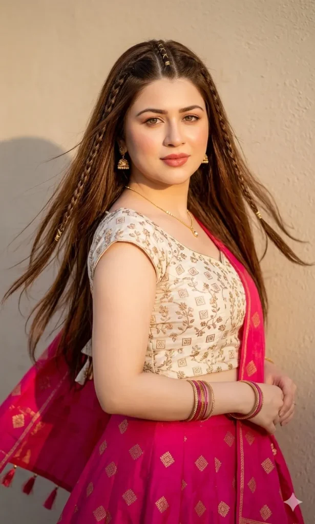 create prompt Ultra-realistic portrait against a beige wall with warm golden sunlight and breezy flow. She wears a vibrant pink festive lehenga with subtle golden square motifs and an off-white embroidered blouse with cap-cut sleeves. A matching pink dupatta flows gracefully over her shoulders: Hair: long, straight, flowy, with multiple small front braids including a central middle braid and smaller side braids.