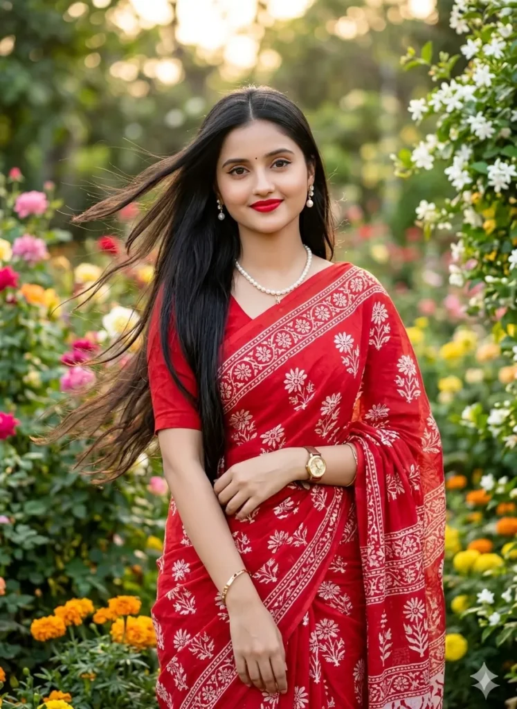 “A beautiful young Indian woman in her early 20s, fair skin, sharp attractive face, big expressive eyes with eyeliner, subtle smile with red lipstick, girls ka hand mein tattoo Bãsâñt Singh long straight black hair neatly parted in the middle and flowing over one shoulder, wearing a vibrant red cotton saree with white floral and traditional block print patterns, short sleeves blouse, pearl necklace, pearl drop earrings, gold watch with brown.