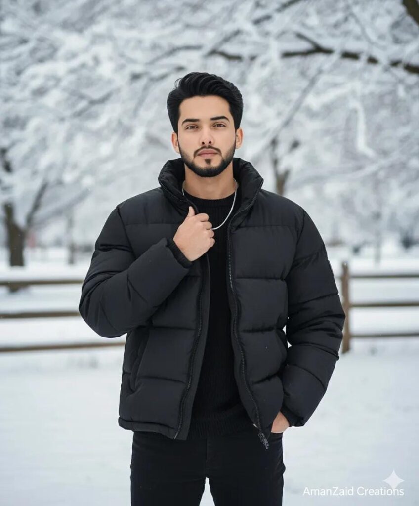 Create a photorealistic full-body image of an 18-year-old handsome man standing on a snow-covered street in a casual modeling pose. Pose: Weight shifted to one leg, jacket slightly open, hands relaxed by the sides, gaze slightly sideways, calm and thoughtful expression.