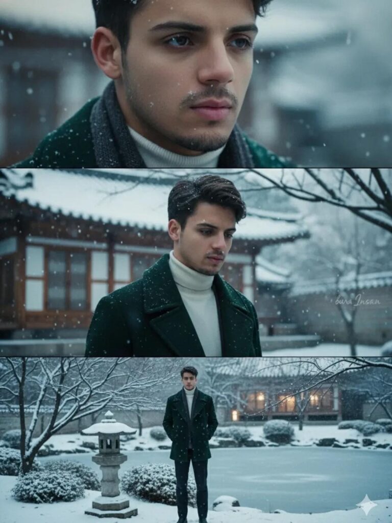 Create a 9:16 vertical cinematic composite photo divided into 3 stacked frames showing the same man in a winter snow scene. The atmosphere is emotional, calm, slightly dramatic – like a moment from a Korean romance film.