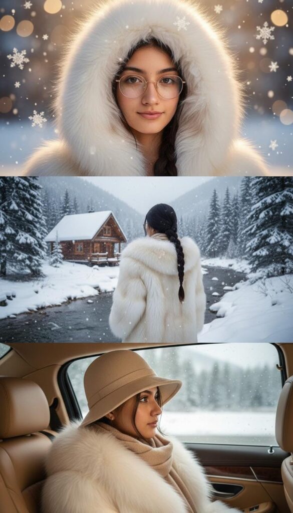 High-quality vertical collage (3:4 ratio), three horizontal frames, cozy luxury winter style, always featuring my face from the reference photo Top: super close-up, young Russian woman, natural makeup (soft pink lips, rasy cheeks), matte glowing skin, expressive eyes, defined lashes. White voluminous faux fur hood frames face, delicate snowflakes fall, dreamy snowy bokeh, vibrant yet refined colors, warm and luxurious mood. Middle: