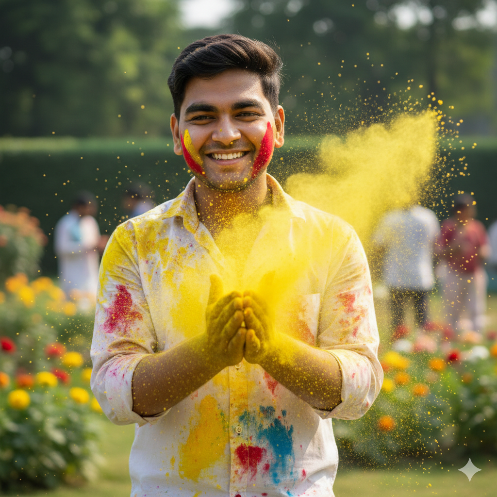 Ultra-realistic Holi festival portrait using my uploaded photo as the face reference, joyful young man smiling naturally, hands pressed together in front of chest covered in bright yellow Holi powder, vibrant yellow color powder exploding and flying across the frame, white button-up shirt splashed with multicolor paint stains (yellow, red, blue), red powder streak on one cheek, playful festive expression, dynamic powder particles frozen mid-air, outdoor garden background softly blurred with