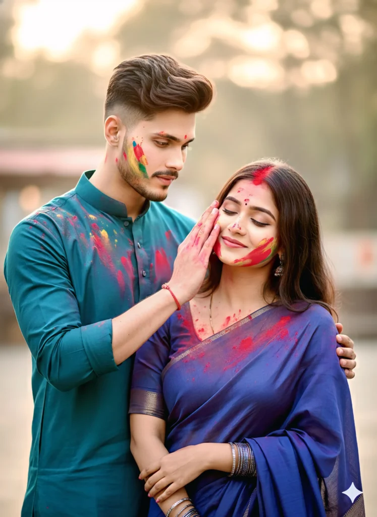 Face refrence Ultra-realistic romantic Holi New couple prompt portrait outdoors. A young South Asian man in a teal kurta gently holds a young London Goa from behind while applying bright red gulal on her cheeks. The girl age 21 wear with Purple blue saree small bindi, eyes closed with a soft smile. Vibrant colors on faces, shallow depth of field, creamy bokeh background, warm natural light, cinematic color grading, sharp focus, 8K photorealistic.