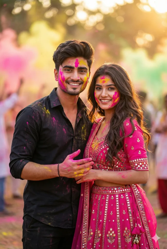 A high-fidelity, cinematic portrait of the young man from the reference image, maintaining his exact facial features, short dark hair, and light beard. He is smiling joyfully and standing next to a beautiful girl with long, wavy dark hair. They are celebrating Holi, with vibrant pink and yellow powder smeared on their faces and hands. The girl is wearing a bright pink traditional lehenga with intricate mirror work. The background is a soft-focus,