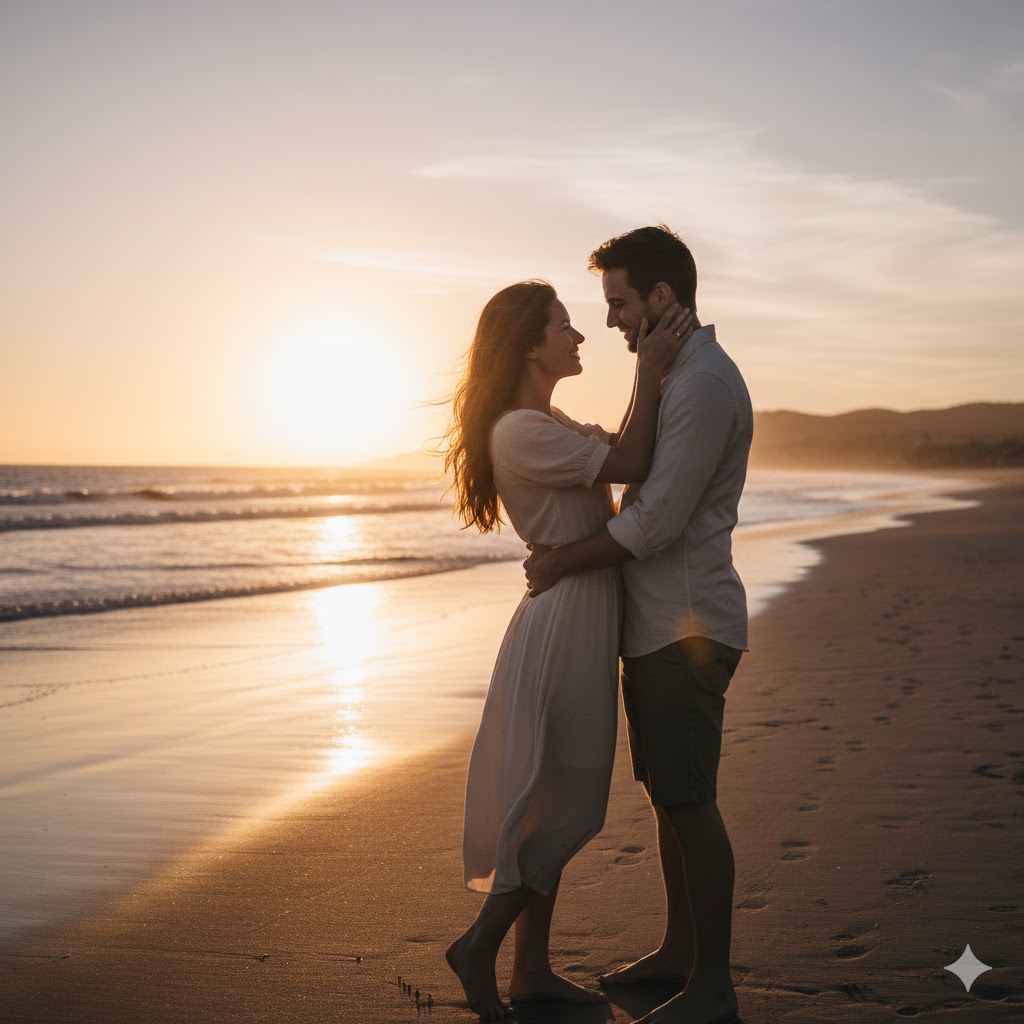 A romantic couple hugging gently during golden sunset on a quiet beach, soft warm sunlight glowing around them, emotional love atmosphere, cinematic lighting, realistic style, slow wind effect, peaceful sky, high detail, depth of field, dreamy mood, ultra HD, natural colors, Valentine vibe, aesthetic composition, heartfelt connection moment.