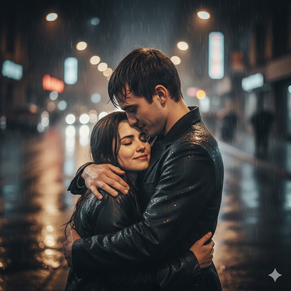 A young couple sharing a warm emotional hug in light rain, city street background with blurred lights, romantic mood, cinematic atmosphere, soft reflections on road, realistic expressions, emotional storytelling, shallow depth of field, high detail, moody lighting, love feeling, ultra realistic style, dramatic romantic environment, dreamy composition.