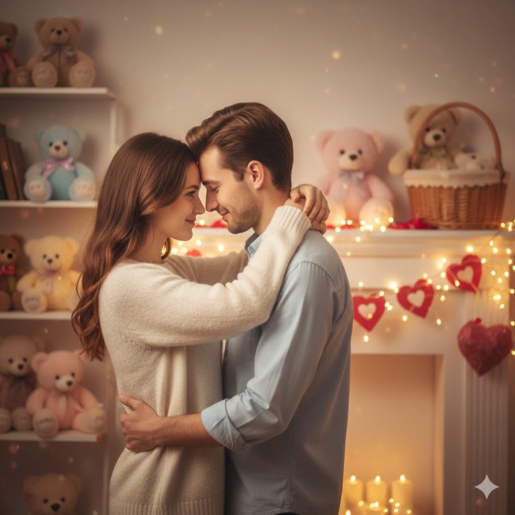 A sweet romantic hug scene with soft teddy bear theme, cozy indoor setting with warm lights, cute love atmosphere, pastel colors, gentle smiles, emotional connection, realistic style, soft glow lighting, high detail, Valentine decoration background, dreamy romantic mood, ultra HD, heartwarming aesthetic composition, pure love expression moment.