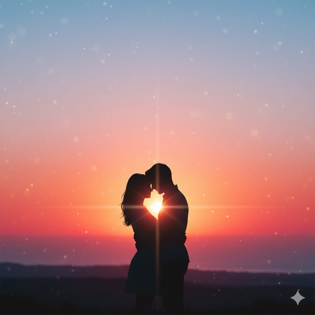 Romantic silhouette of a couple hugging against colorful sunset sky, dramatic lighting, emotional love vibe, artistic cinematic style, soft glow horizon, peaceful background, minimal aesthetic composition, high detail, dreamy romantic atmosphere, ultra HD, warm color tones, timeless love moment, beautiful emotional storytelling visual, elegant romantic scene.