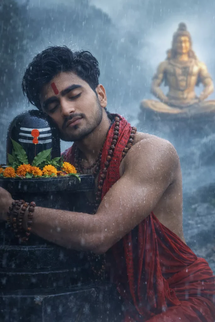 A young man embraces a black Shiva Ling during heavy rain, eyes closed in deep devotion. He wears a red dhoti and a red prayer stole with Sanskrit script, rudraksha bead malas on arms and neck, with a red tilak on his forehead. The Shiva Linga is decorated with white sacred markings, a red bindu, marigold flowers, and green bilva leaves, placed on a stone pedestal. In the misty Himalayan background, a glowing golden statue of Lord Shiva sits in meditation, partially blurred.