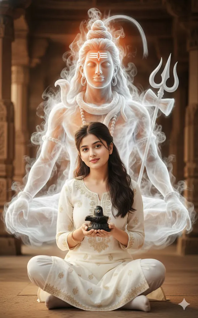 Ultra-realistic portrait of a girl sitting gracefully beside a divine Lord Shiva figure made entirely of ethereal white smoke in front of Shiv Mandir. Outfit: white kurta with golden embroidery, white pant, he holds small black shiva lingam idol in both hand. he is slightly leaning her head on lord Shiva. White smokey shoulder while looking gently toward the camara. Beside him, lord shiva form guggests orange colour and golden attire with subtle jewelry hinst, a trishul.
