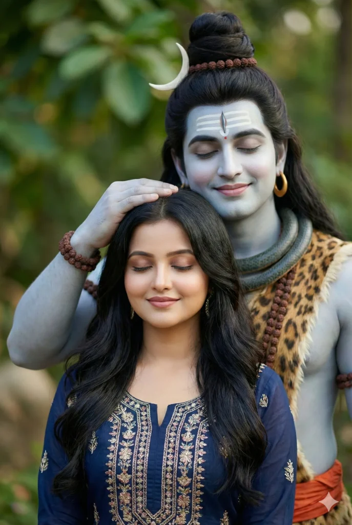 Merge the girl's image with the provided image of Lord Shiva so that it looks like Lord Shiva is lovingly giving her blessings by gently placing his hand on her head. Both should have their eyes closed, smiling softly,