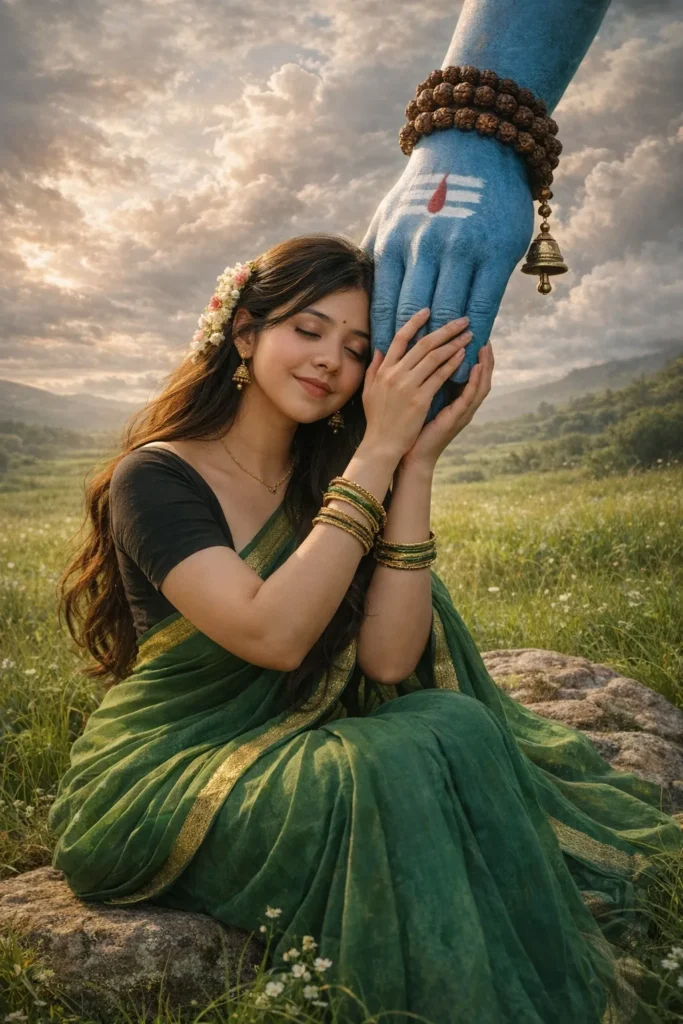 Create a realistic image of this girl sitting on a rock in the green grass fields under cloudy sky.wearing green saree with black blouse.her hair long and styled with flowers. Her skin glowing and natural. she closed her eyes with devoted while holding the giant blue hand of Lord Shiva that descends from the sky The divine hand is painted with sacred white tripundra lines and a red tilak, adorned with rudraksha beads around the wrist. #god #godpromot #divinepromot #shiv