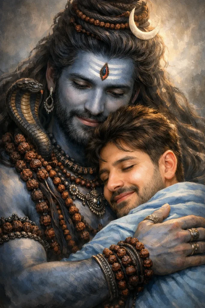 Prompt A hyperdetailed digital painting, close-up, dramatic portrait of **Lord Shiva embracing a young man. Lord Shiva is depicted with **athereal blue -gray skin**, a prominent third eye, dark matted hair (jatta), and ornate dark jewelry (rudraksha). Shiva's expression is one of supreme benevolence and protective calm** as he looks down. The young man is nestled securely in the embrace, wearing a light blue garment, with his eyes closed in a **beatific, deeply peaceful, and content smile**